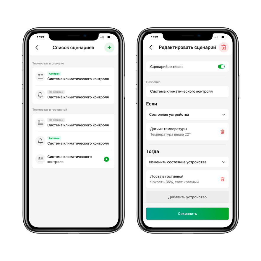 Пользователь может выбрать нужное устройство (или группу устройств) из списка, задать название и настроить его в соответствии со своими потребностями. Также можно настроить сценарий для нескольких устройств (например, одновременно включить свет и кондиционер в случае прихода гостей).