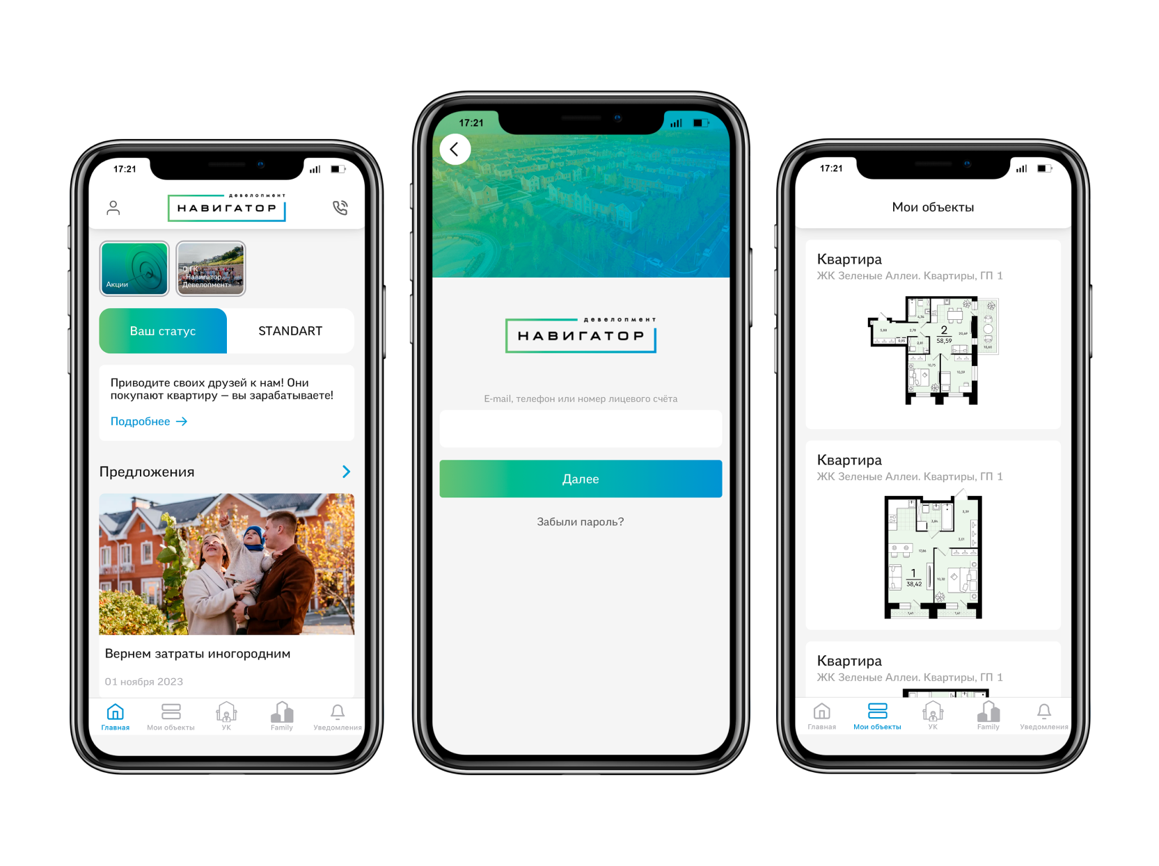 Единая платформа для управляющей компании застройщика «Навигатор. Девелопмент» включает в себя мобильные приложения и веб-кабинеты для жителей и сотрудников УК.