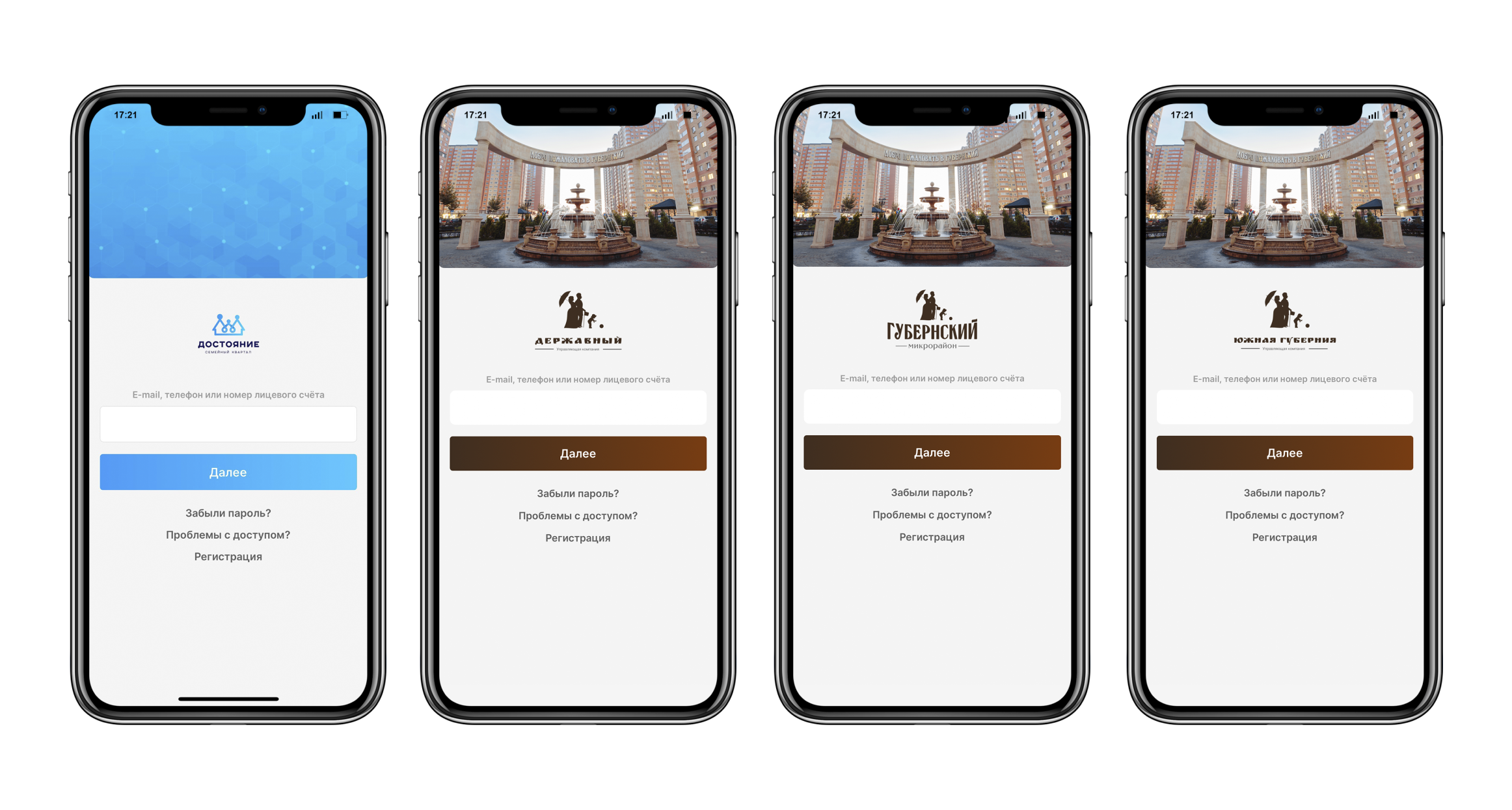 Так как к платформе подключено несколько жилых комплексов, у каждого из которых своя управляющая компания, было решено создать отдельные брендированные приложения для каждого ЖК.