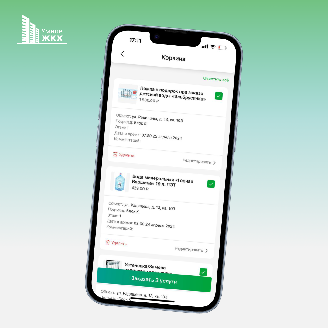 После обновления в личном кабинете жителя появилась корзина услуг. Теперь пользователи могут добавить несколько услуг в корзину и сделать одну общую заявку. При этом в карточке диспетчера будут отображаться и другие заявки по заказанным собственником услугам.